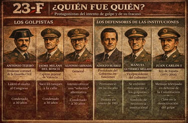 El rostro más visible del intento fue el del teniente coronel Antonio Tejero, acompañado por el general Jaime Milans del Bosch y el general Alfonso Armada, cuya implicación abrió uno de los capítulos más controvertidos del proceso. La figura de Armada, antiguo colaborador de la Casa Real, alimentó durante años teorías sobre posibles soluciones “de consenso” o maniobras políticas paralelas.