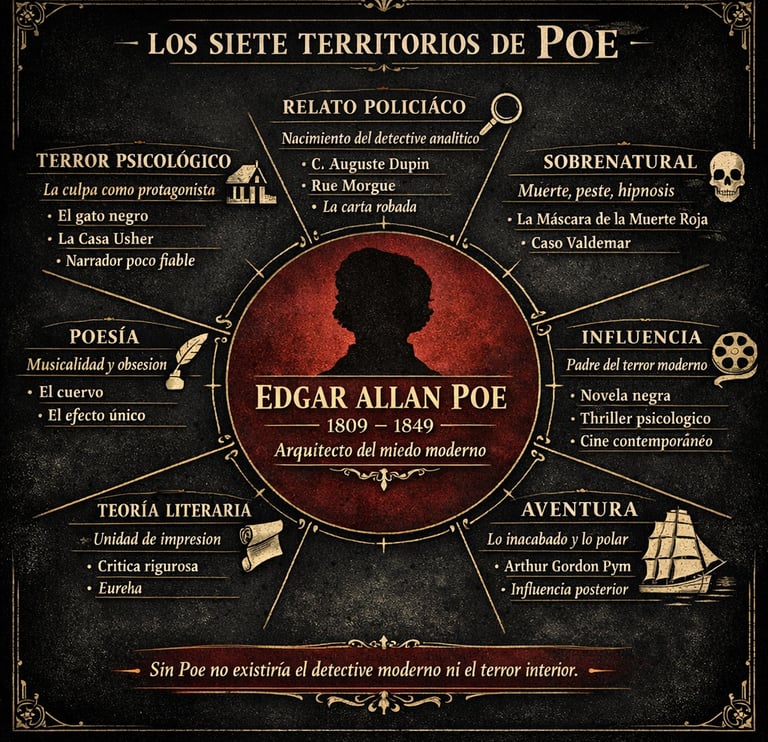 Si en lo policíaco funda un género, en el terror lo transforma. Antes hubo novela gótica —desde Horace Walpole hasta Matthew Lewis—, pero en Poe el miedo deja de ser decorado y se convierte en psicología.