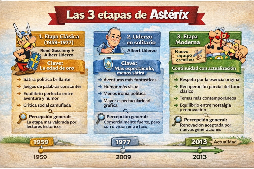 Tras la muerte de Goscinny en 1977, Uderzo continuó la serie en solitario, marcando una nueva etapa en la evolución del cómic.