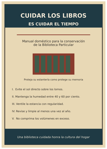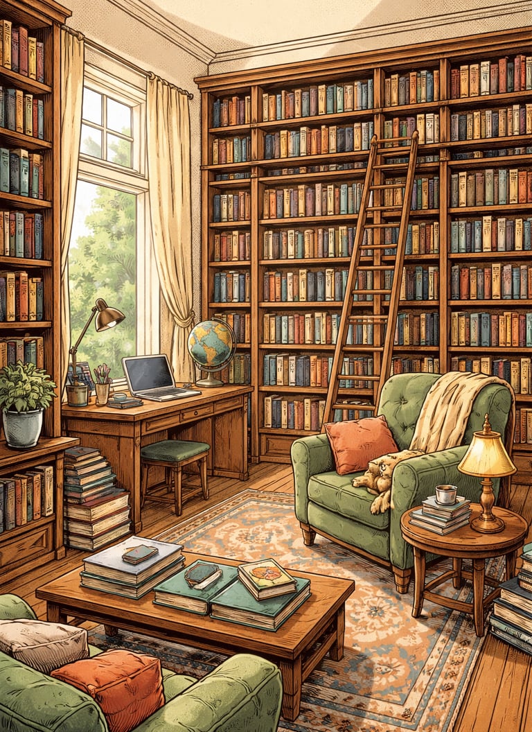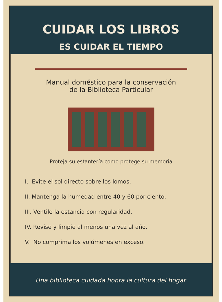 Estanterías firmes, ancladas, con ligera ventilación trasera. Libros separados del suelo. Un sillón cercano si es posible. Una lámpara que no deslumbre pero acompañe.
