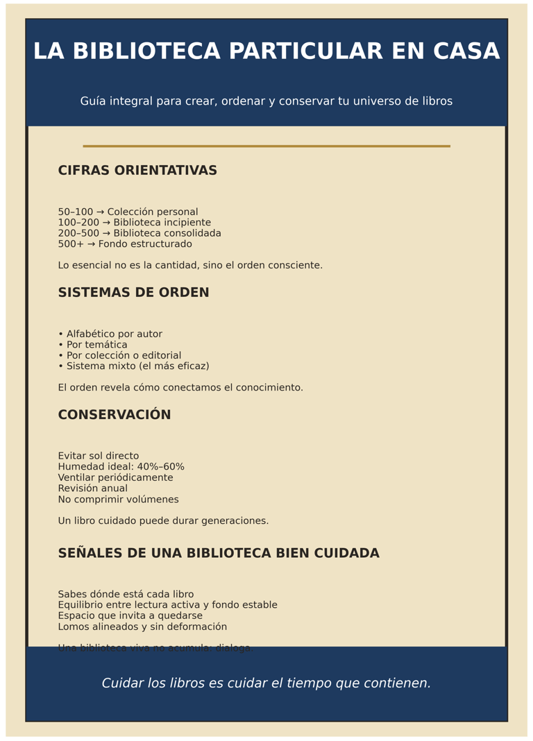 Enrique Sierra * Tener una biblioteca particular en casa va mucho más allá de acumular libros en una estantería. Implica organizar, conservar y dar sentido a una colección que refleja nuestra identidad lectora y nuestra historia personal. En esta guía exploramos cuántos libros se necesitan para considerarla biblioteca, cómo mantenerla limpia y operativa, qué sistema de orden funciona mejor y cómo transformar cualquier rincón del hogar en un espacio dedicado a la lectura y al pensamiento.
