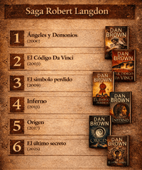 La saga de Robert Langdon cuenta actualmente con seis novelas publicadas. Aunque El Código Da Vinci es la más famosa, no fue la primera protagonizada por el simbólogo de Harvard. El orden de publicación —y también el recomendado de lectura— es el siguiente: